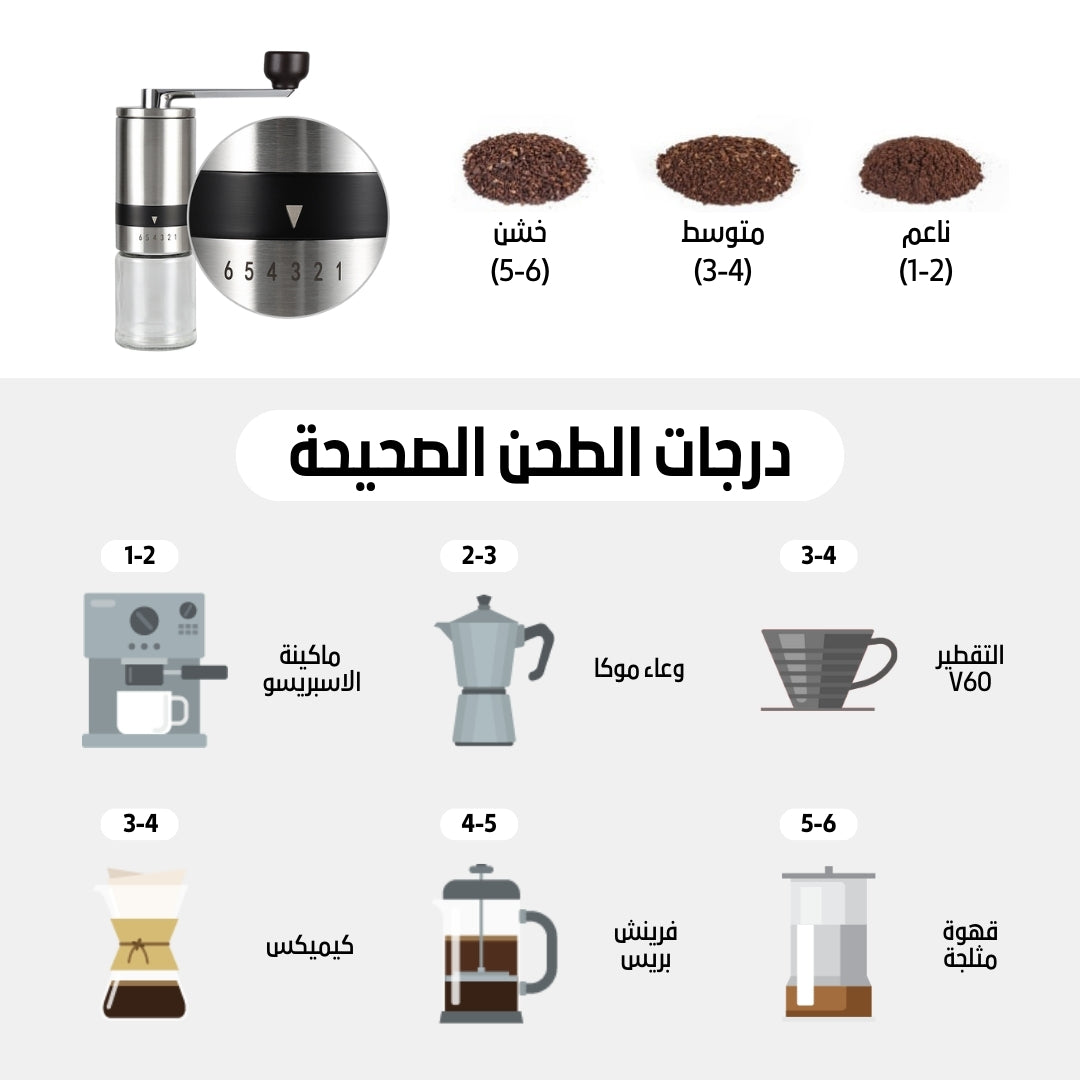 مطحنة قهوة يدوية: مصنوعة من الستانلس ستيل والزجاج والسيراميك مما يضمن الحصول على نفس درجة وجودة الطحن في كل مرة، المطحنة لديها 6 درجات للطحن مما يمكنك من استخدامها لتحضير القهوة بطرق مختلفة تعمل بالتروس والمقبض من الألمنيوم والخشب الصلب
