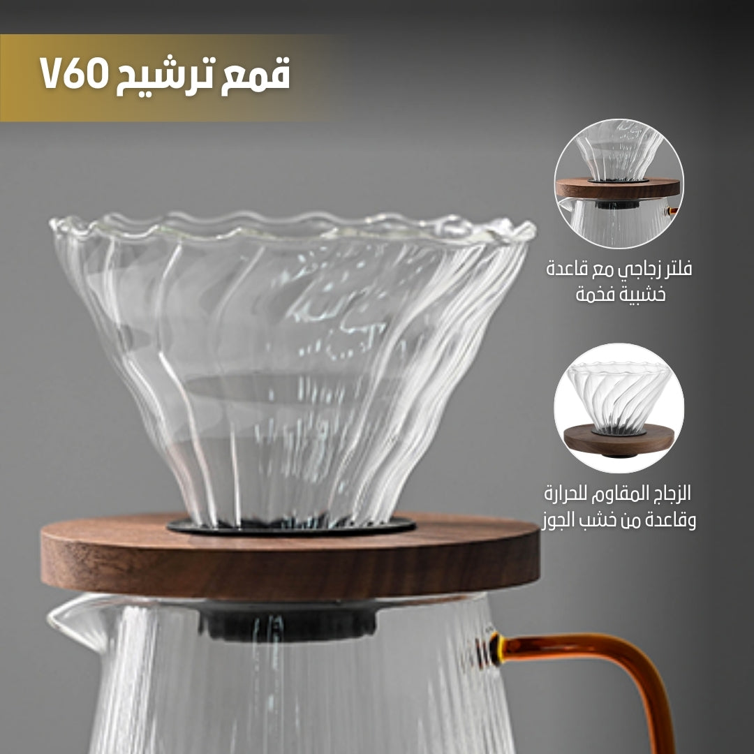 قمع ترشيح: فلتر زجاجي مع قاعدة خشبية فخمة مصنوع من الزجاج المقاوم للحرارة وقاعدة من خشب الجوز